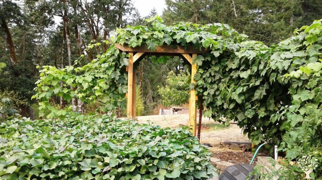 Fruit crops grown at Ahimsa include: apples, pears, figs, plums, raspberries, grapes, and thornless blackberries. Principal vegetable crops include broccoli, sweet potatoes, kale, cauliflower, cabbage, collards, tomatoes, peppers, eggplant, potatoes, garlic, onions, corn, summer and winter squashes, cucumbers, carrots, beets, celery, parsley, basil, Swiss chard, beans, peas, lettuces, various Asian leafy greens, a variety of herbs, and hazelnuts. Our efforts at food production are intended to provide us with food year-around through all-season gardening, drying and freezing and in-ground and geo-thermal and electrically powered cold storage.