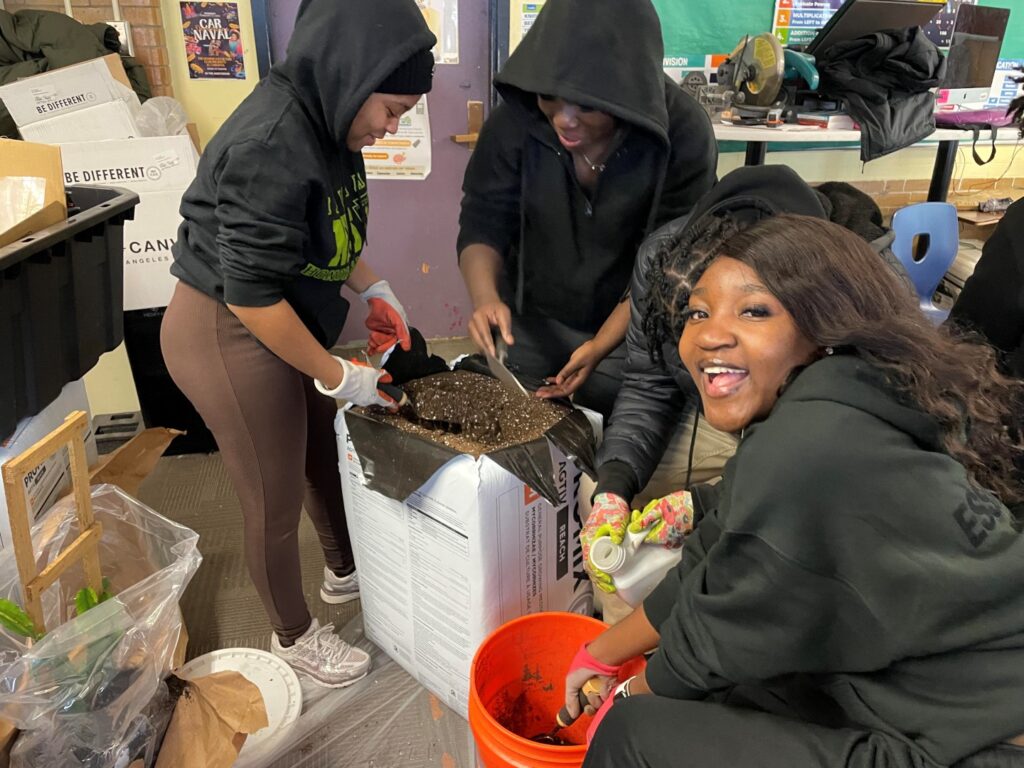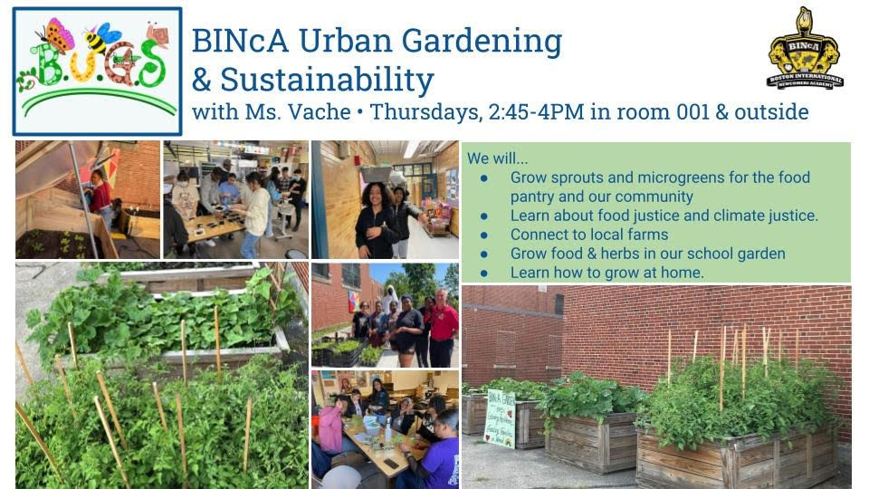 BINcA is a high school within the Boston Public Schools in Massachusetts. Our school services exclusively multilingual learners and immigrant youth. We have many established wraparound services for our students and families beyond academics (ex. support for housing, immigration, childcare, employment, etc..). We focus on food security via our in-house food pantry that distributes non-perishable staples (and fresh produce, funding-dependent) every two weeks. We have several raised gardening beds where we grow produce for our families. Half of the beds are managed by my after school gardening club (“BUGS” – BINcA Urban Gardening and Sustainability). We align the club’s activities with the food pantry in order to harvest on distribution days.